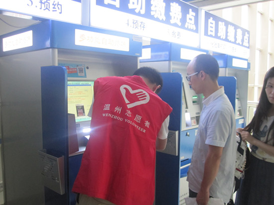 “微笑天使”暑期社会实践队在温州医科大学附属第一医院进行了第七天以志愿者形式展开的实践活动,期间全体20名成员身着红色志愿者马甲热情地为焦急的人群服务。