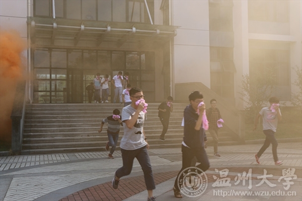 下午2点左右,全体参加演习的校卫队员、义务消防队员在11号楼东面门厅口集合,灭火练习的器械也一并运送到位。参与演习的化材11号楼约200名师生在老师的带领下也做好了疏散准备。随着蔡校长“演习按预订计划进行”命令下达,参与人员迅速就位,演习正式开始。