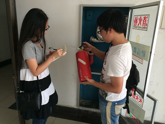 门口集合,开始分组分工进行检查。队员们三人一组,每组检查一层。队员们的主要任务是检查消火栓、水泵、灭火器以及应急灯是否完好。水泵要去用手转一下,看是否因为生锈而转不开。灭火器主要检查其压力情况,指针指向绿色代表正常,若指向黄色代表压力过低,需要更换。化材本土av