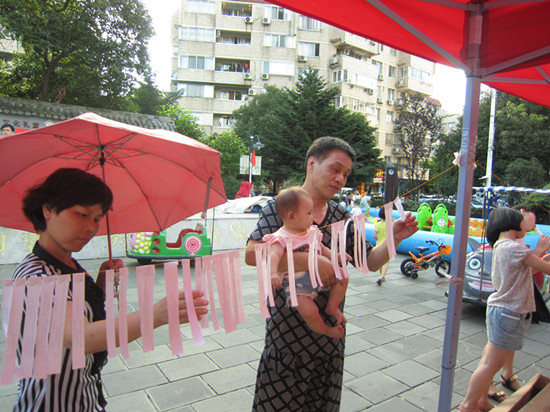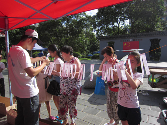 队员们一到达郭公山社区就开始积极投入到工作中。与8日下午一样,队员们向过往居民分发自绘的环保袋与温州市城市管理与执法局制作的环保宣传手册。这次的活动得到温州市城市管理与执法局和郭公山社区的大力支持,并且为绿袖子实践队提供了一些场地用品,同时也制作了许多的环保知识宣传手册,为绿袖子实践队对环保宣传的工作作出了很大贡献。过往的居民也很耐心的听完队员们关于这次活动的介绍。尽管艳阳高照,队员们各个都汗流浃背的,但是没有人怠慢,也没有人有怨言,一次又一次热情地为路人讲解。宣传结束,这些手工艺品还将被署名作者,并放在郭公山社区的低碳厅展览以此来加强宣传力度。绿袖子实践队队员们用实际行动向温州市民阐述着“变废为宝灵巧手,美丽温州共守候”的宗旨。