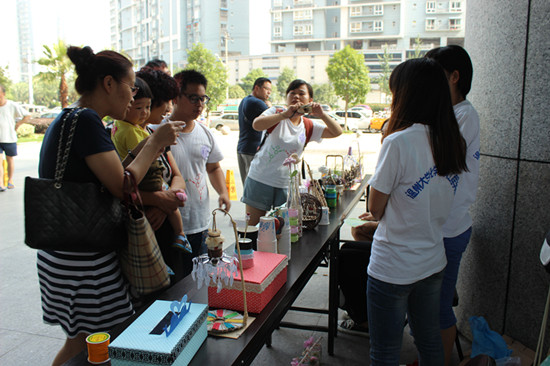 实践队员们在一边的桌子上展示了7月6日比赛制作的由废旧物改造成的手工DIY作品,一边组织了环保知识有奖竞答。队员们一部分为路人讲解DIY作品的原料和作用,一部分负责知识竞答,一部分负责奖品的兑换。工会大厦门口的许多家长与孩子都参与到活动中,很多大人也被一些生活常识难住了,我们的队员就细心为他们解答。